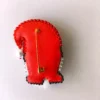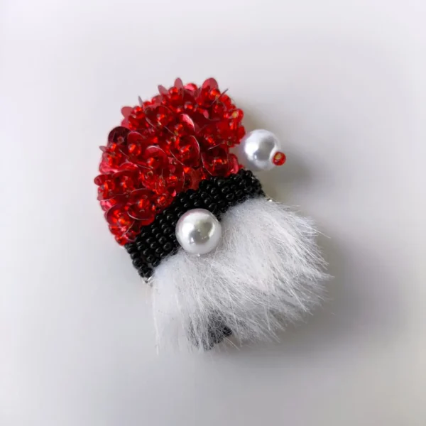 Broche artesanal inspirado en el Nomo navideño, elaborado con lentejuelas rojas, mostacilla negra, perlas y detalles en pelo blanco. Un accesorio lleno de brillo y encanto ideal para la temporada de Navidad. Perfecto para regalar o realzar tus looks festivos con un toque artesanal colombiano.