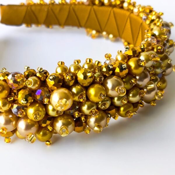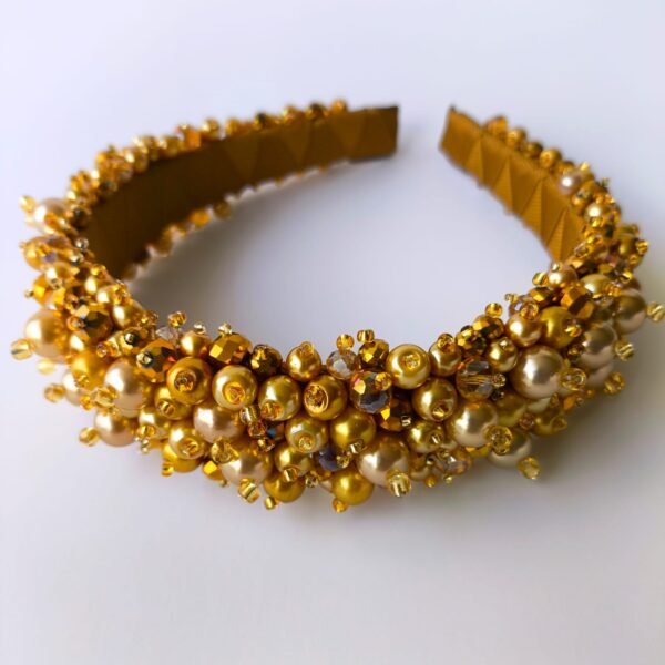 Diadema recamada elaborada en Perlas, Murano, mostacillas, chaquiras y piedras variadas en  Diseño, técnicas, tamaño, materiales y colores específicos.