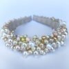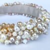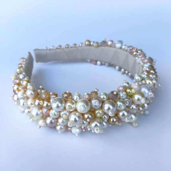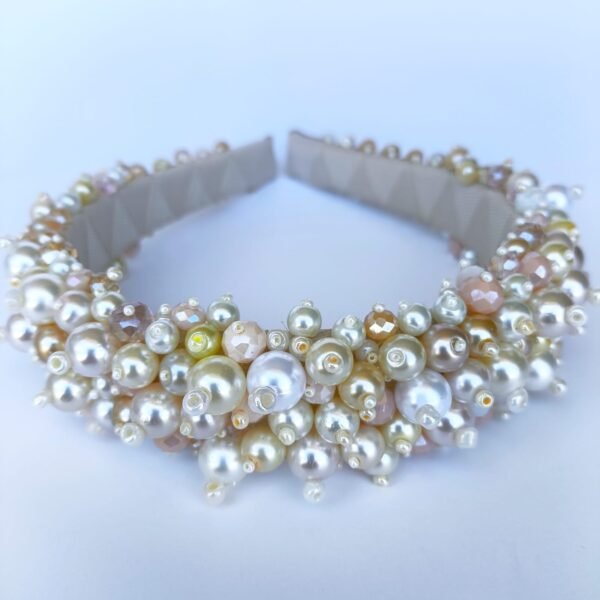 Diadema recamada elaborada en Perlas, Murano, mostacillas, chaquiras y piedras variadas en Diseño, técnicas, tamaño, materiales y colores específicos.