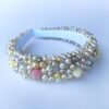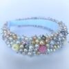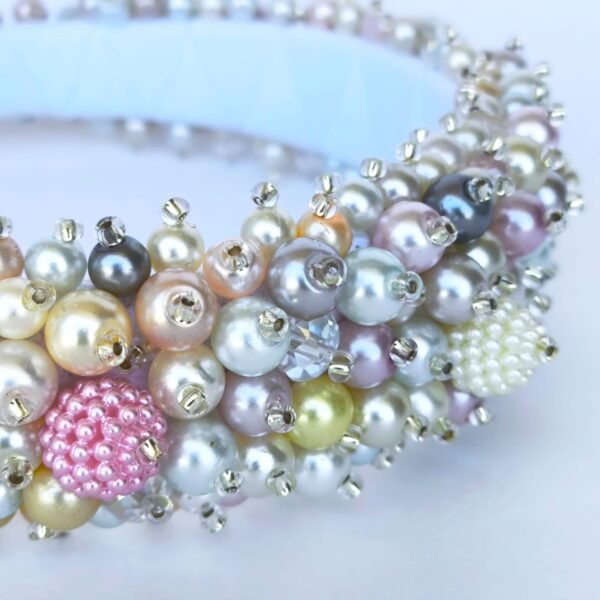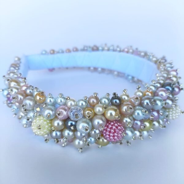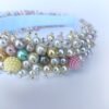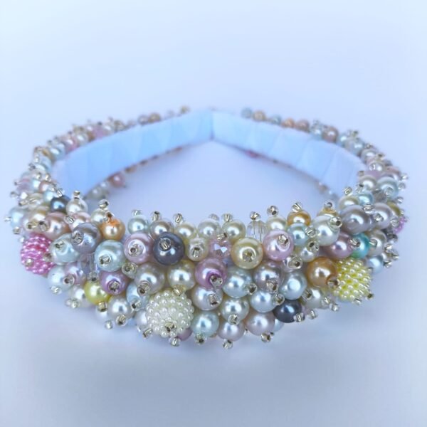 Diadema recamada elaborada en Perlas, Murano, mostacillas, chaquiras y piedras variadas en Diseño, técnicas, tamaño, materiales y colores específicos.