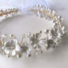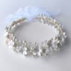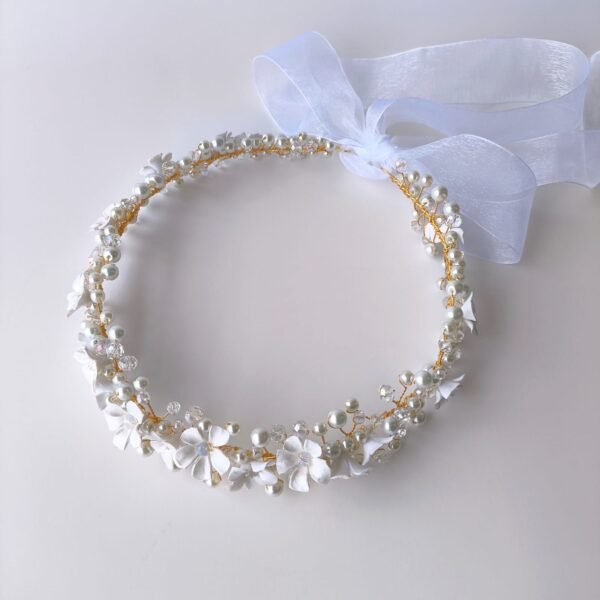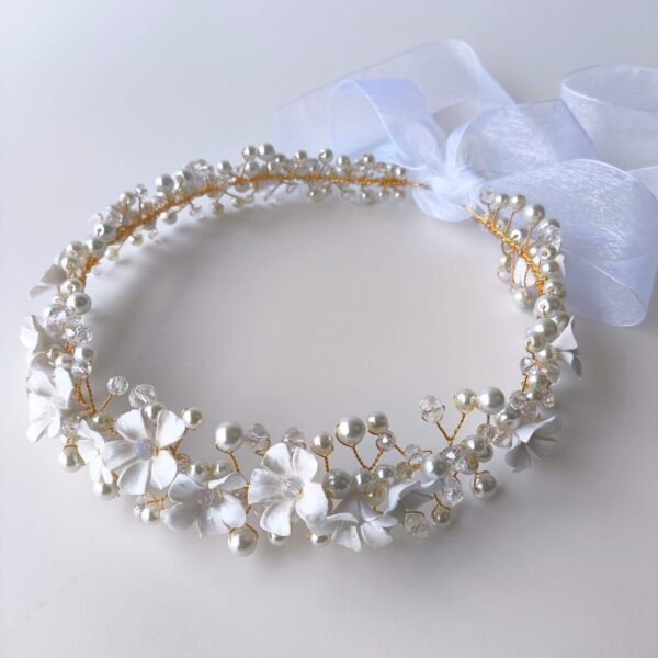 Elegante tiara artesanal elaborada en alambrismo, ideal para novias o primera comunión. Decorada con perlas de vidrio, cristales muranos y flores de porcelana fría, combina brillo y delicadeza. Mide 50 cm de largo por 4 cm de ancho y está disponible en dorado o plateado. 💍 Hecha a mano en Colombia, es el accesorio perfecto para realzar la pureza y la elegancia en ocasiones especiales.